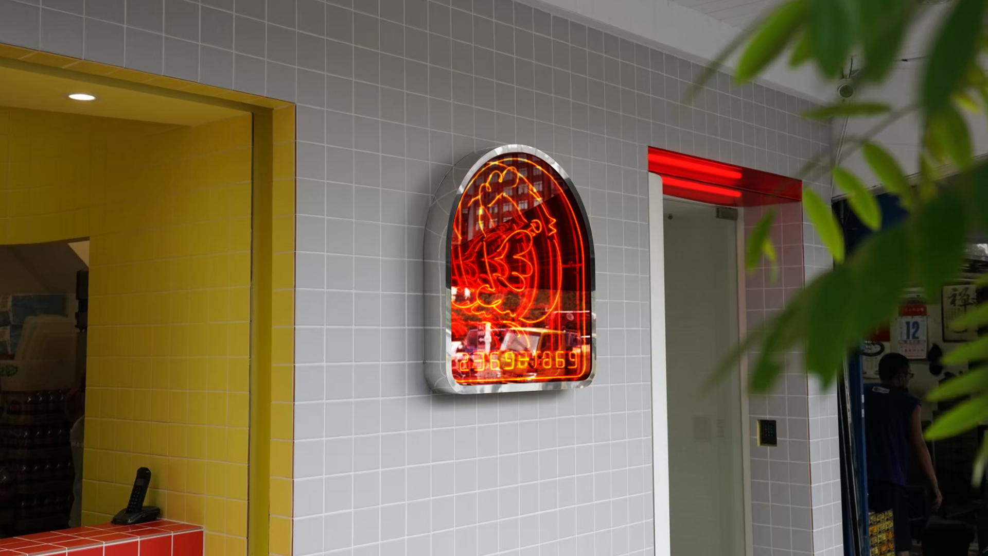 千層鏡燈箱結合了霓虹燈管,利用千層鏡無限延伸的特性,為整體視覺增添了現代與科幻感。這樣的設計不僅提升了形象牆的吸引力,更激發了顧客拍照並上傳社交平台的興趣。