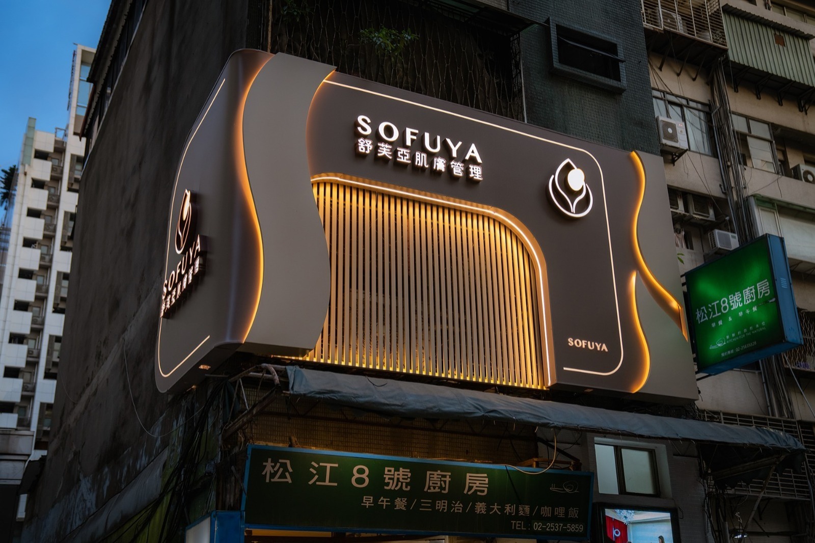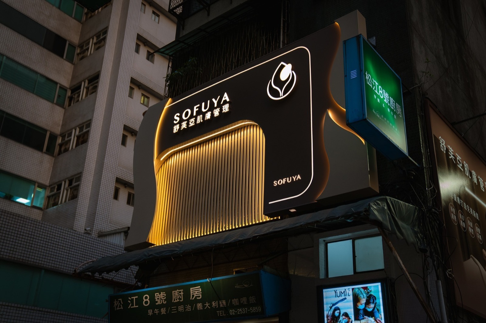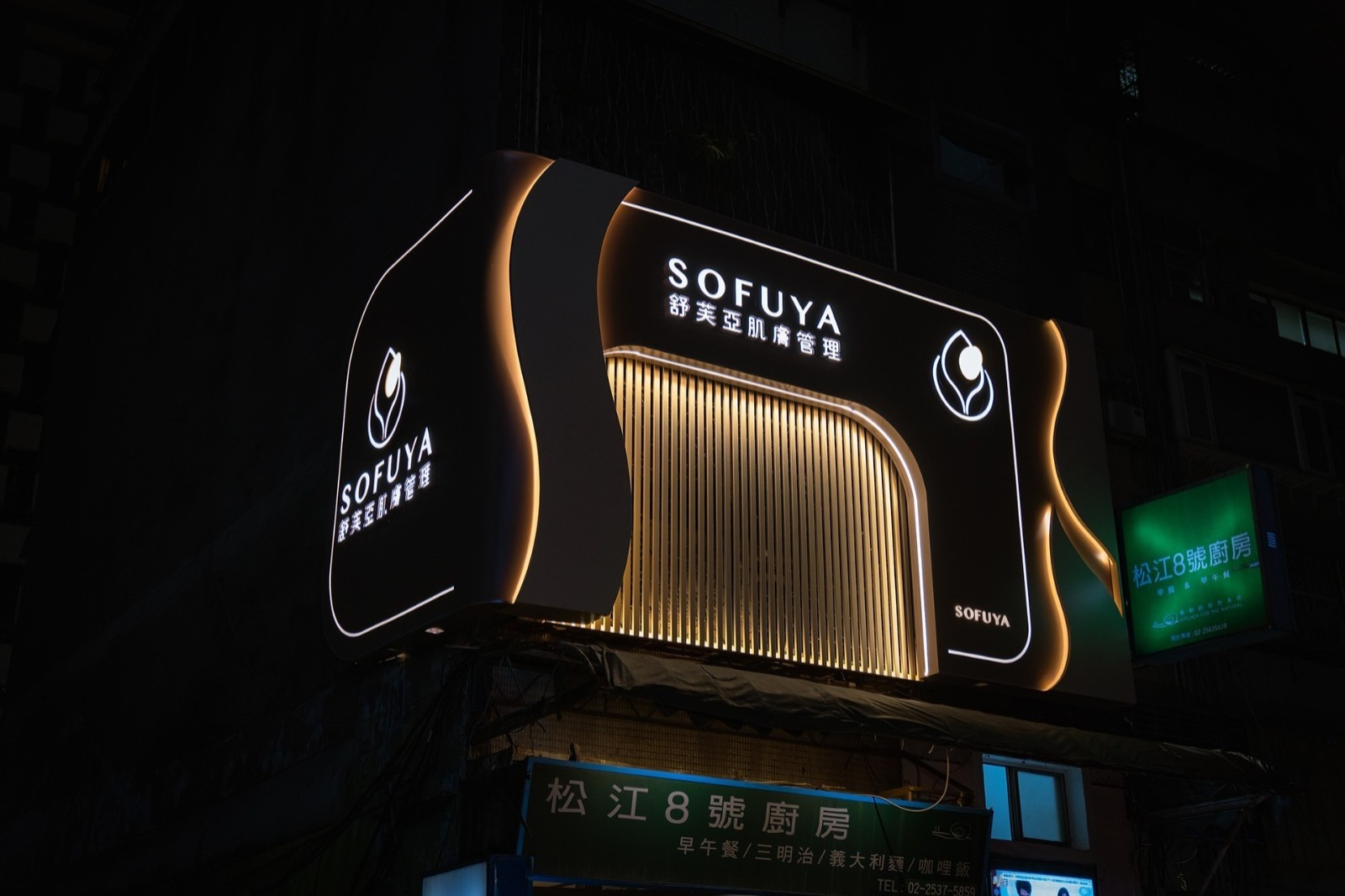 取用「SOFUYA」的開頭字母「S」,設計曲線造型金屬板作層次疊加,並在其後方崁入燈條,營造出質感優雅的夜間氛圍。