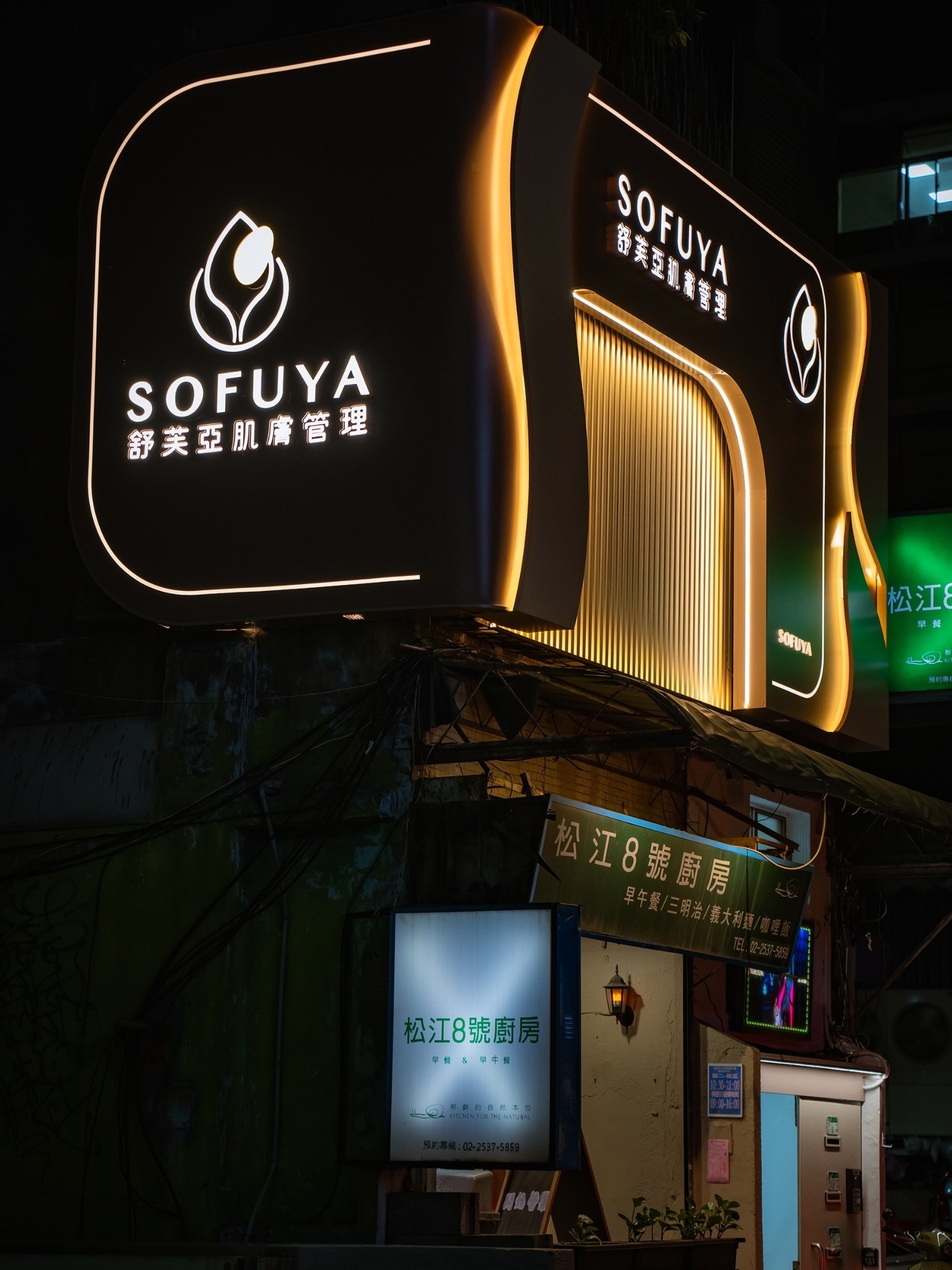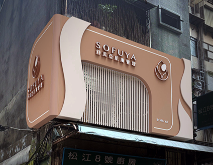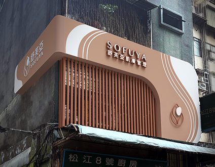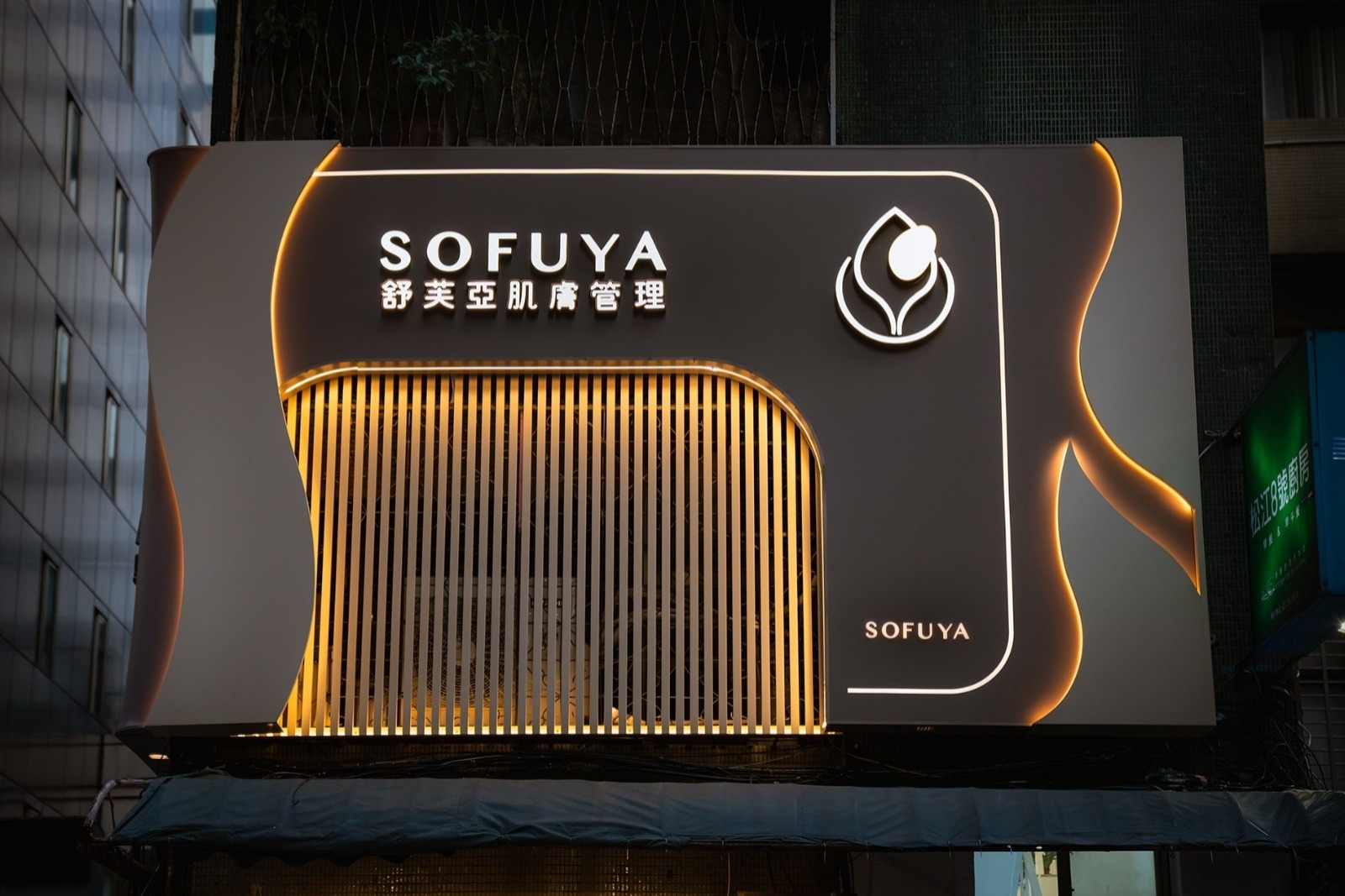 取用「SOFUYA」的開頭字母「S」,設計曲線造型金屬板作層次疊加,並在其後方崁入燈條,營造出質感優雅的夜間氛圍。