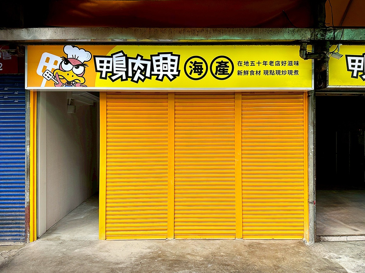 在矩形招牌的限制下,放大「鴨」的主視覺,跳脫原本圓形LOGO的拘束,使形象更活潑親切,並讓圖像與標準字的比例更平衡。去除影響閱讀的複雜底紋,改以乾淨色塊呈現,畫面更簡潔清晰。加入品牌標語後,也更能傳達五十年老店堅持新鮮現做的溫度,整體形象更統一年輕。