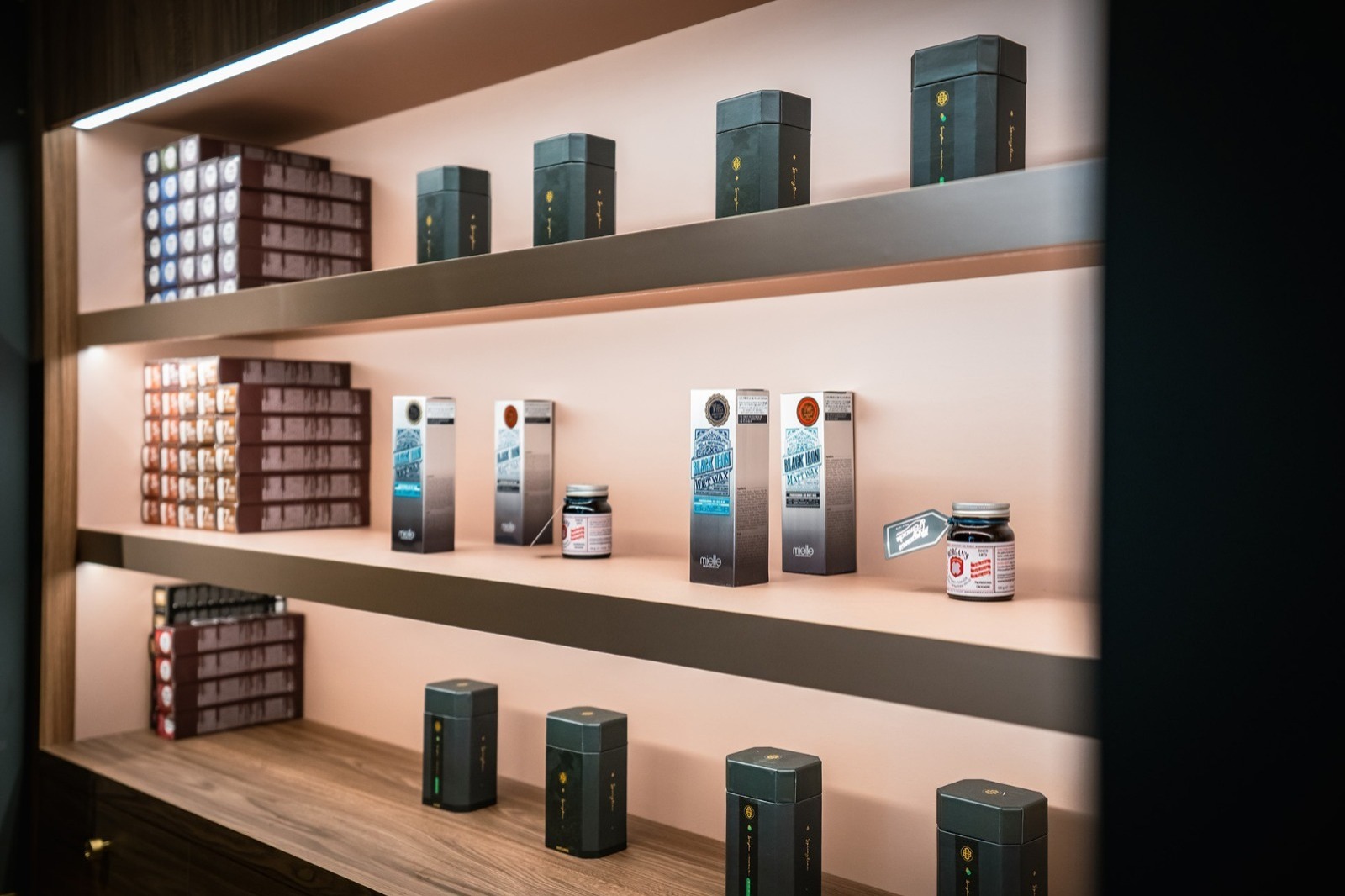 櫃體設計以復古木紋層架為主,選用了深色橡木,搭配古銅金色五金配件,展現沉穩典雅的風格。 層架上陳列高級髮品、鬍鬚修剪用品與其他商品,強調紳士格調。