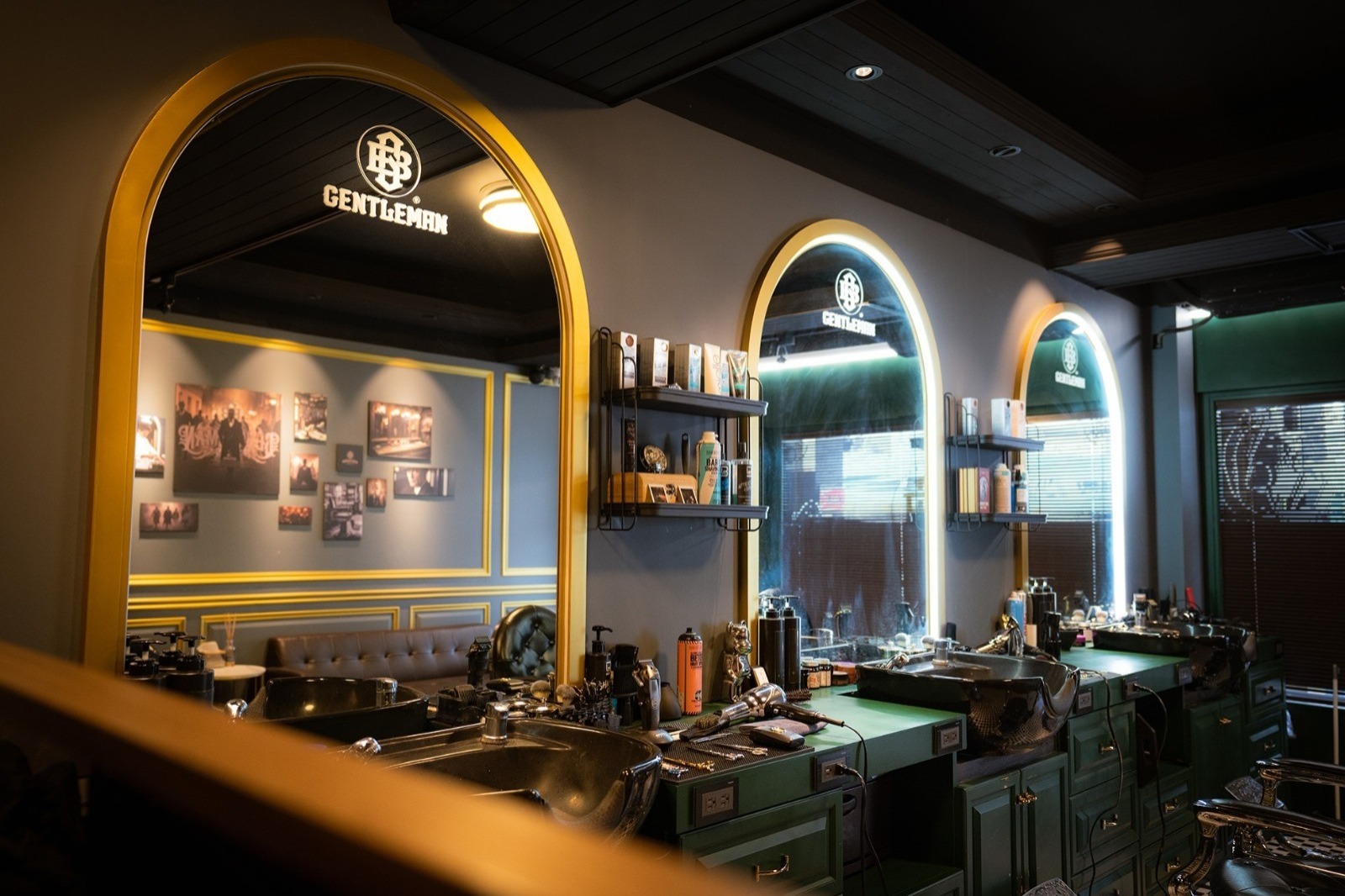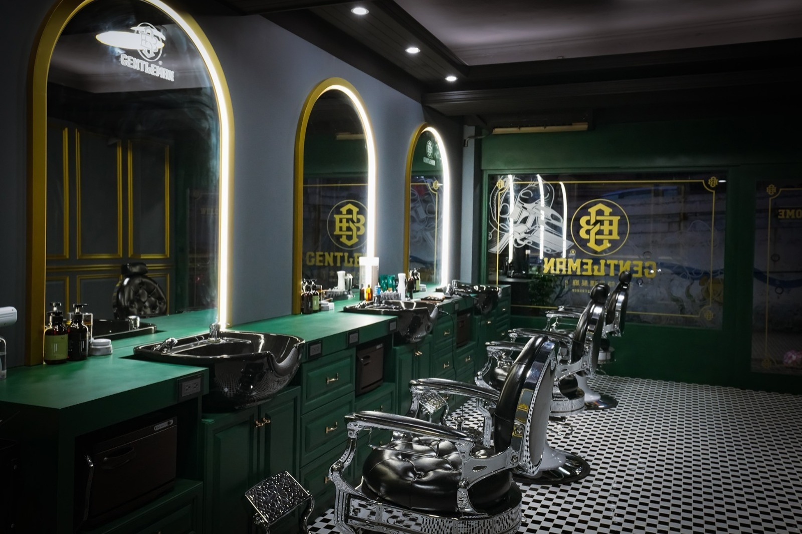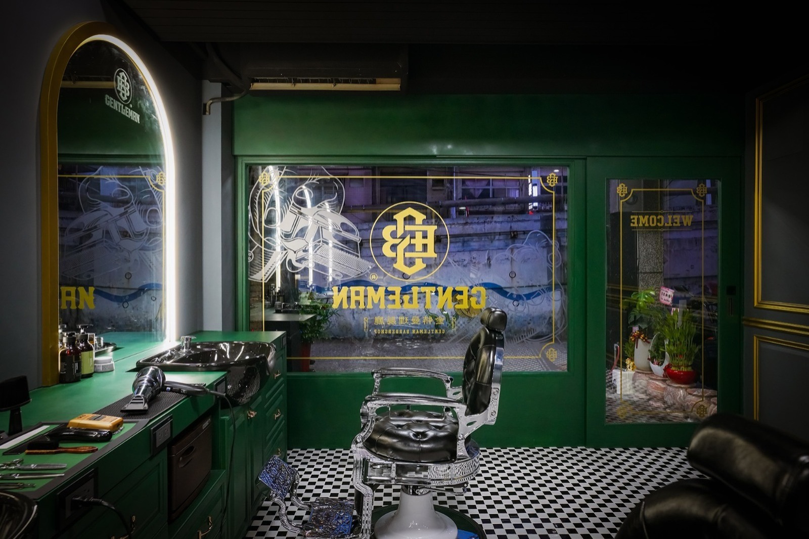 店內環境以英式復古風格為基底,融合古銅金色與深綠色,營造出專業、紳士且極具質感的理髮空間,讓來這裡的顧客享受極致放鬆的理髮體驗。