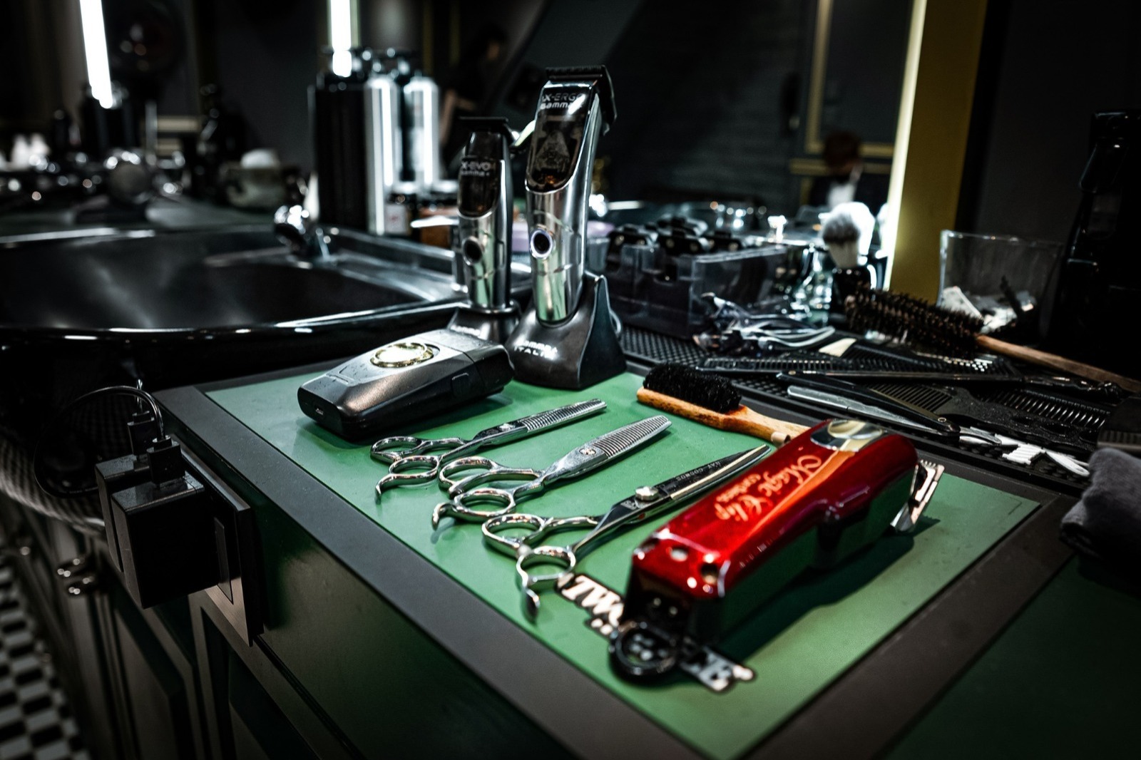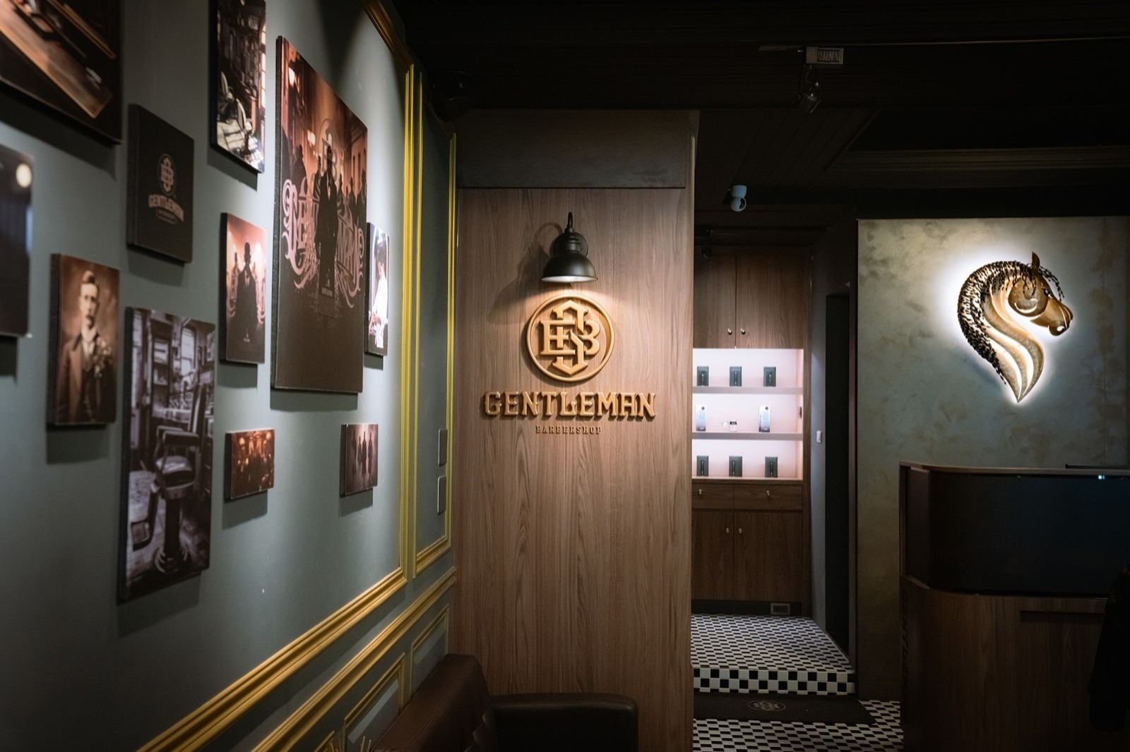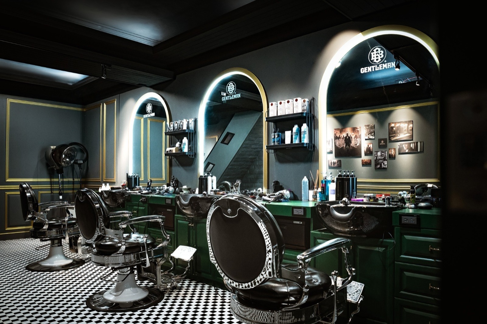 店內環境以英式復古風格為基底,融合古銅金色與深綠色,營造出專業、紳士且極具質感的理髮空間,讓來這裡的顧客享受極致放鬆的理髮體驗。