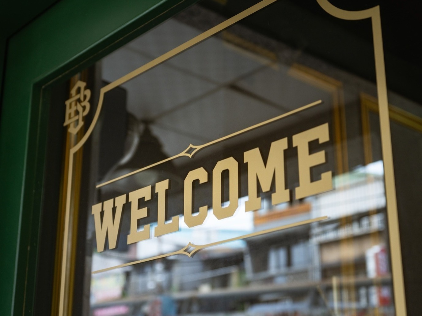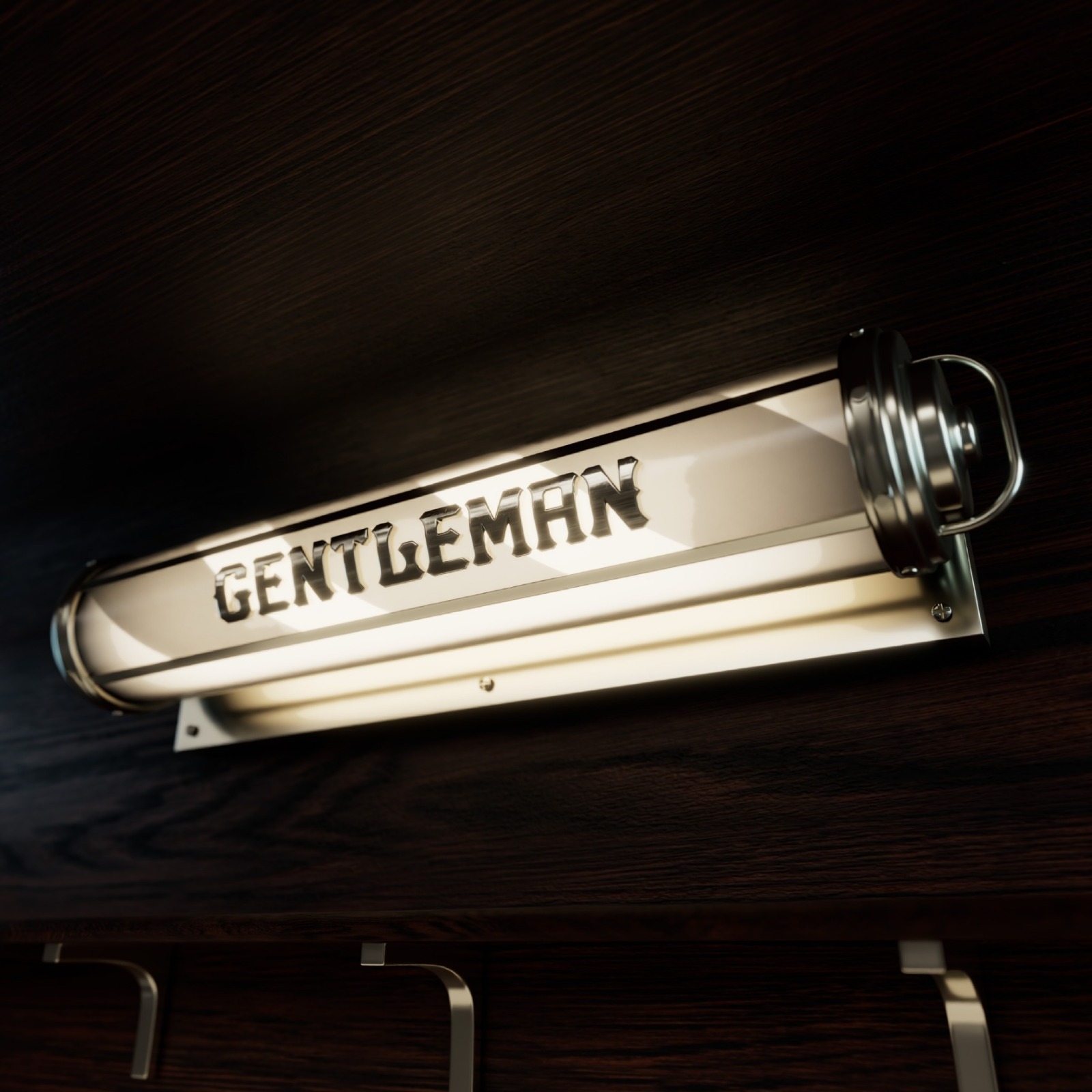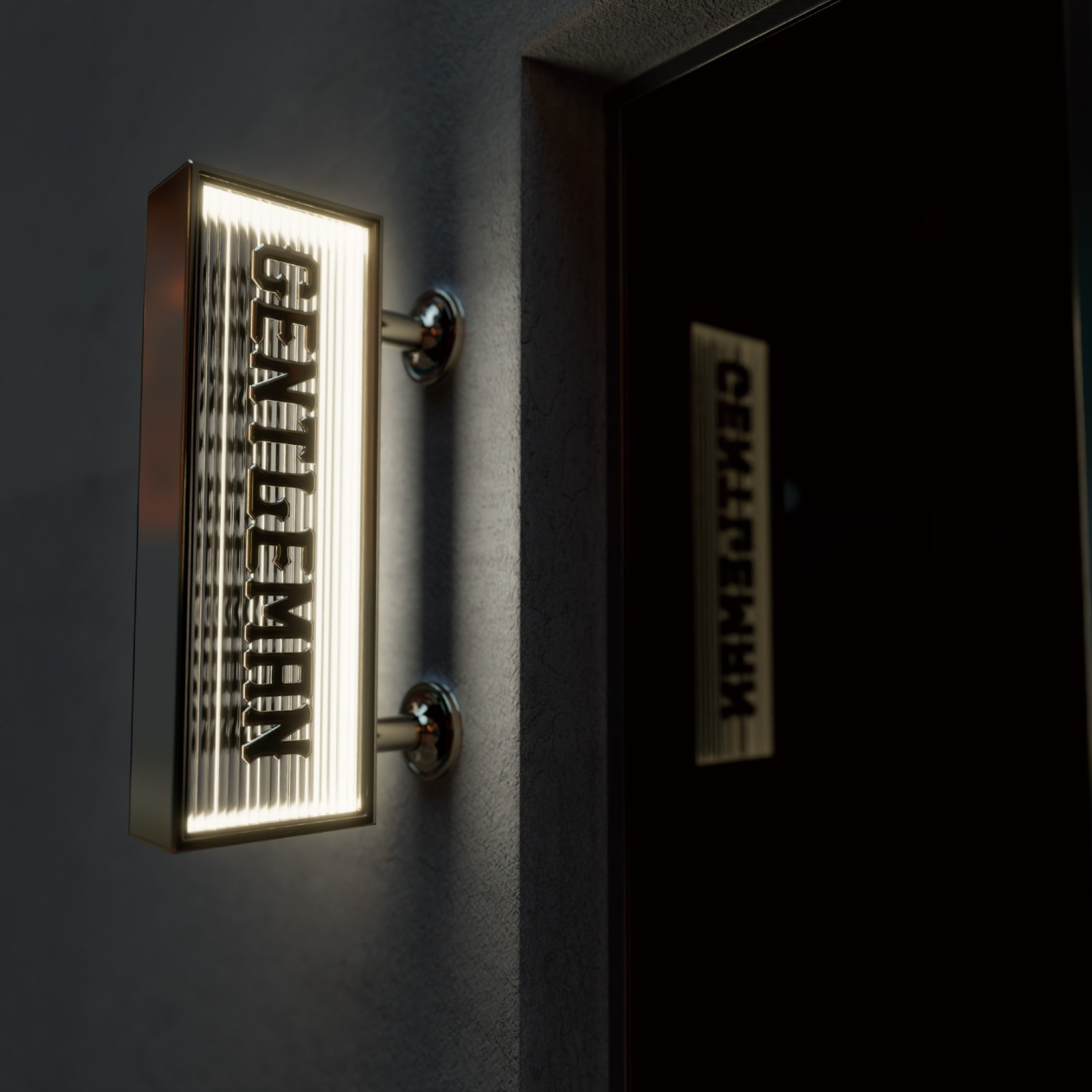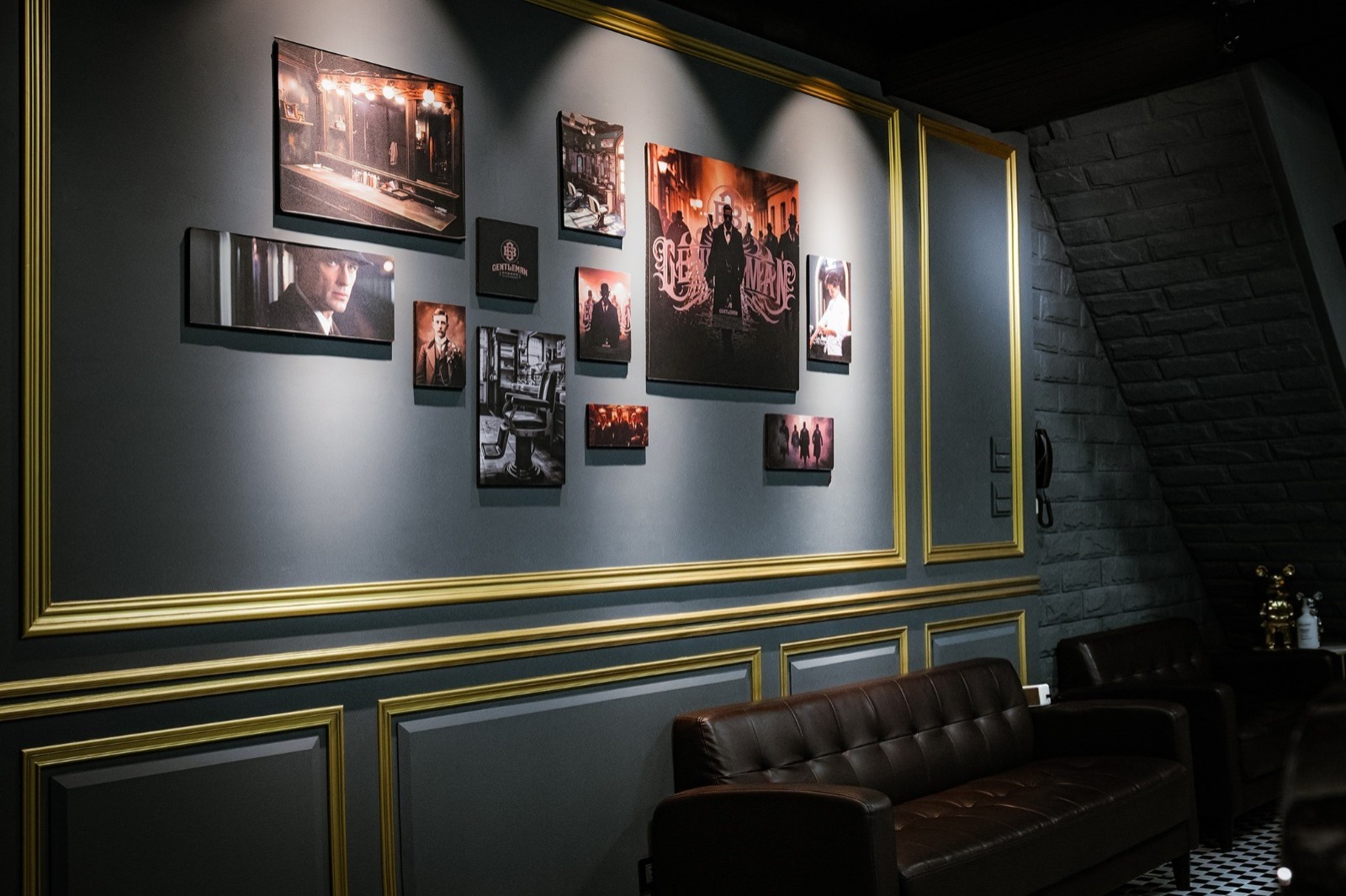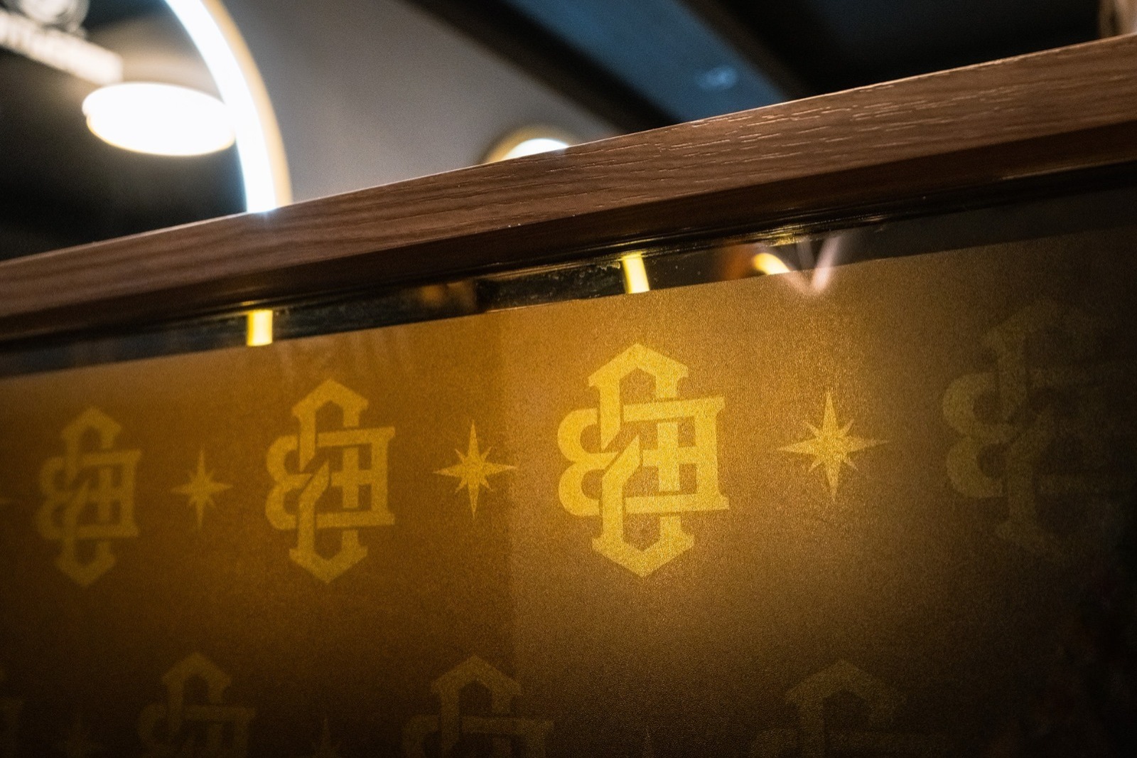 金特曼理髮廳店內的LOGO與標語以古銅金色立體烤漆字設計,安裝於接待區、鏡前牆與其他顯眼位置。這種金屬烤漆在燈光下展現高級質感,與深綠色背景以及深色橡木紋形成強烈對比,增強品牌識別度。