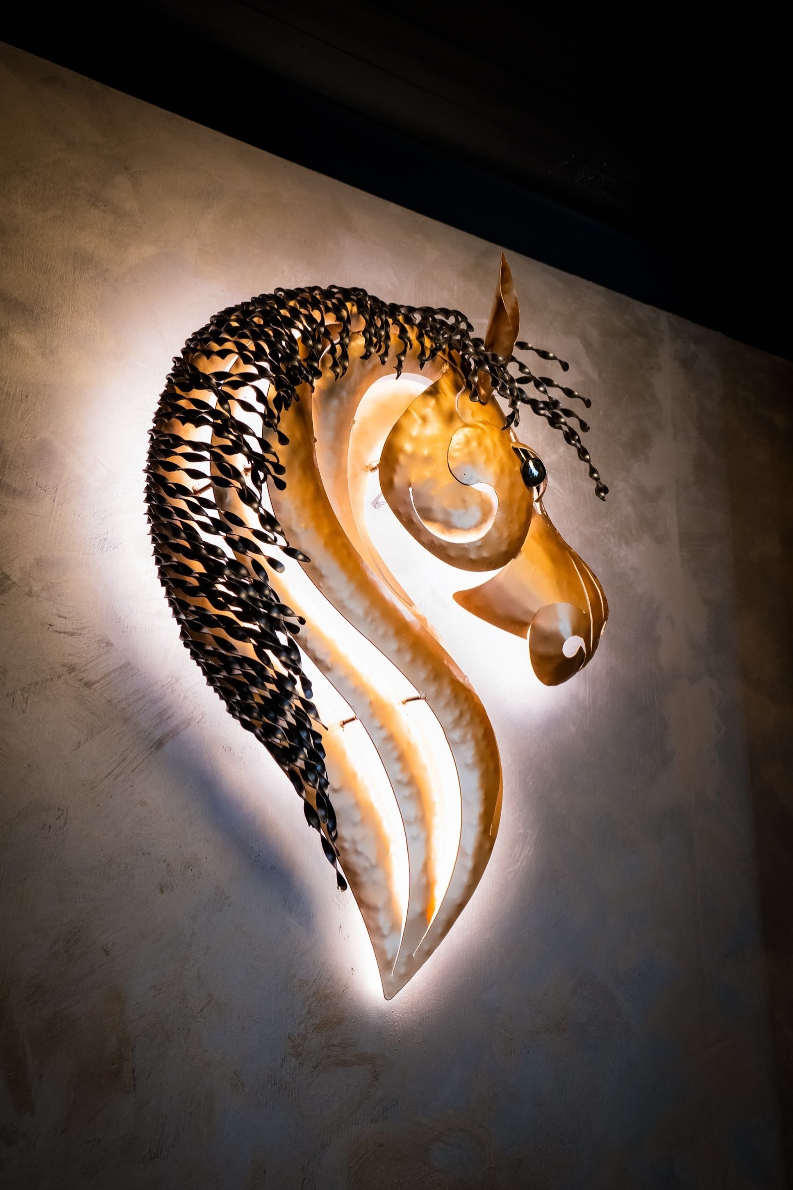 作為視覺亮點,選用了英式風格的金屬馬頭雕塑裝飾,象徵力量與尊貴。設置於櫃檯後方牆面,讓顧客感受到傳統紳士俱樂部的氛圍。